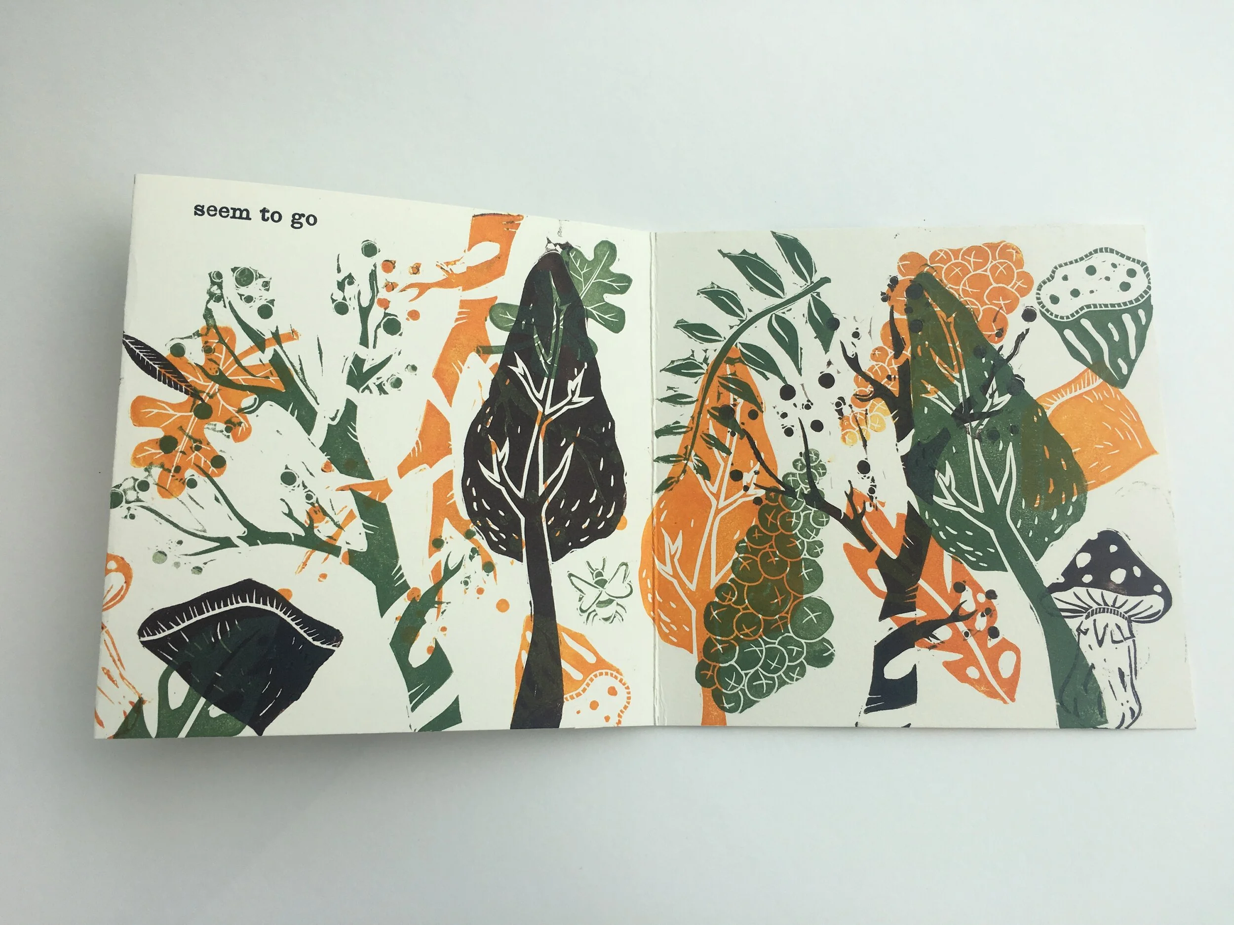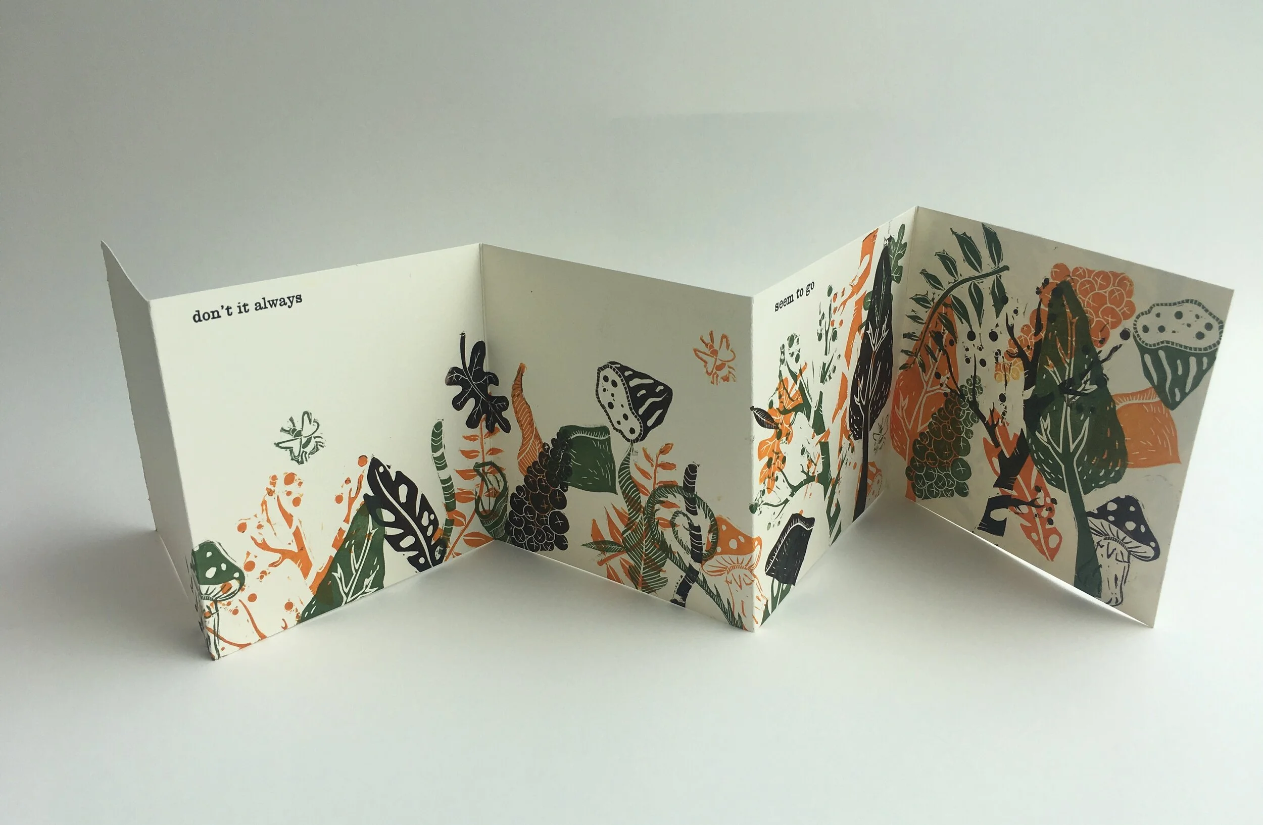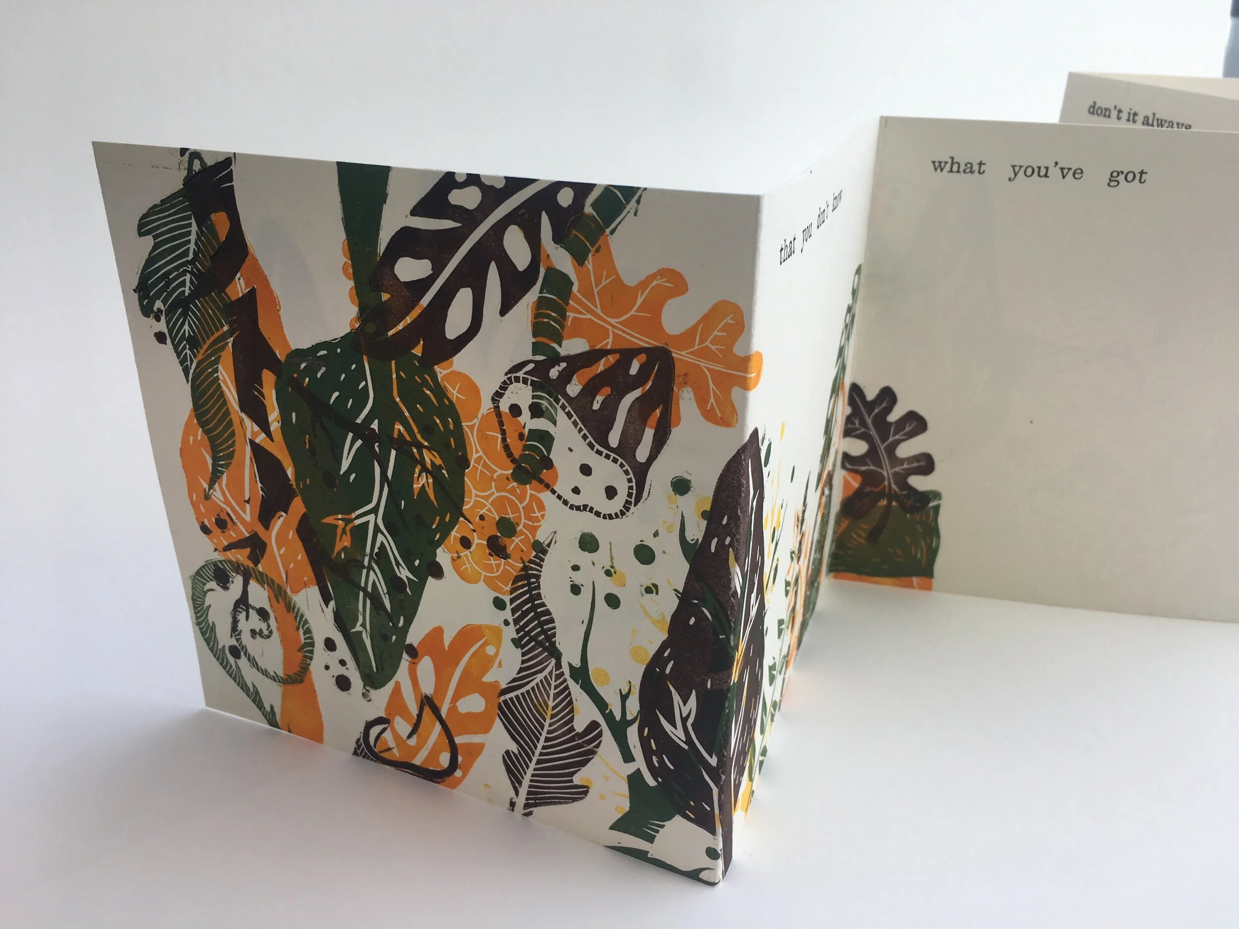 A concertina artist book made with letterpress and three colour linoleum relief stamps. Using lyrics from a Joni Mitchell song, Big Yellow Taxi, this concertina book laments the destruction of nature for profit by the human race, a theme that seems more relevant than ever. Each of the 8 booklets was randomly stamped so they are all unique monoprints.