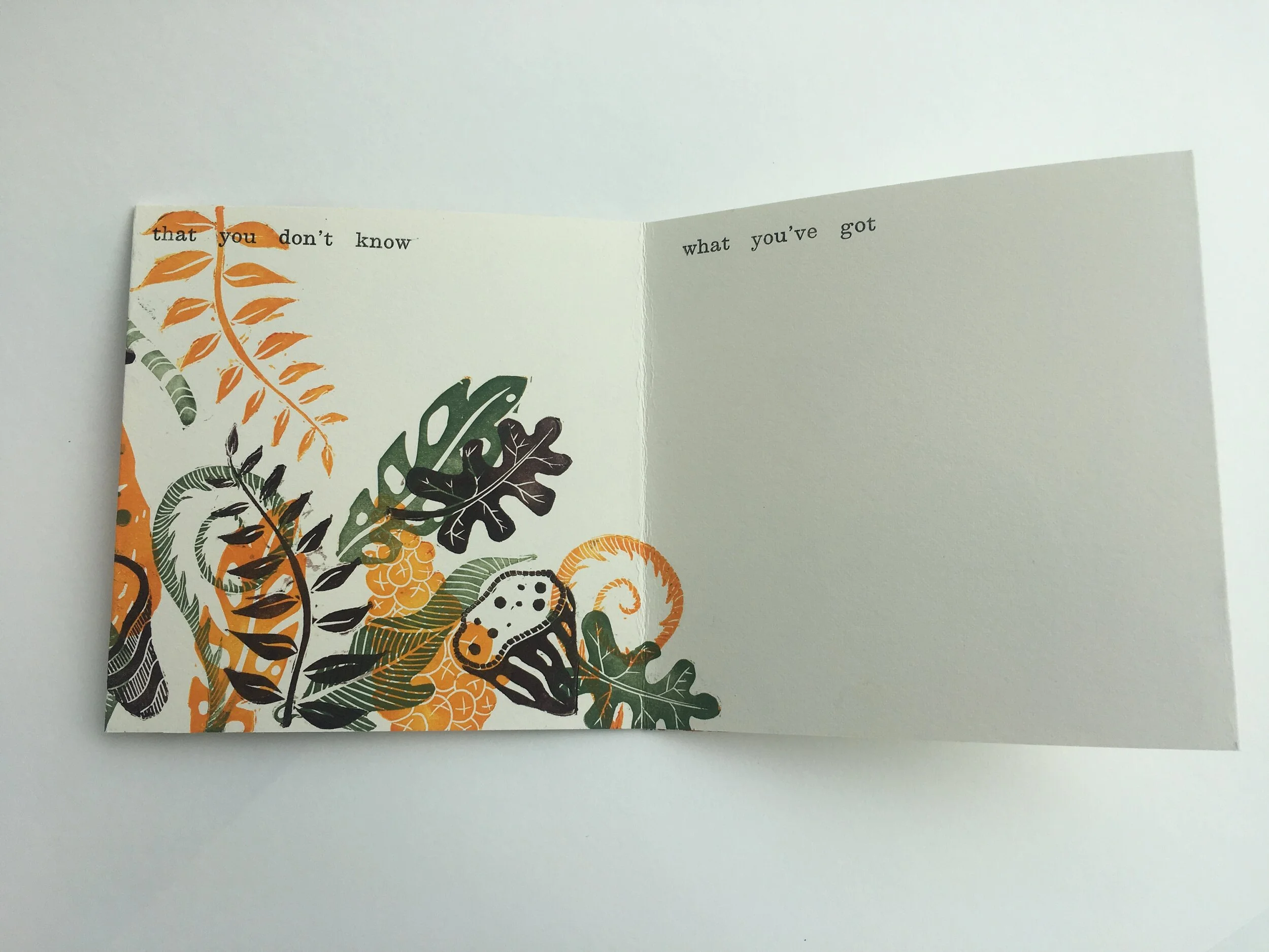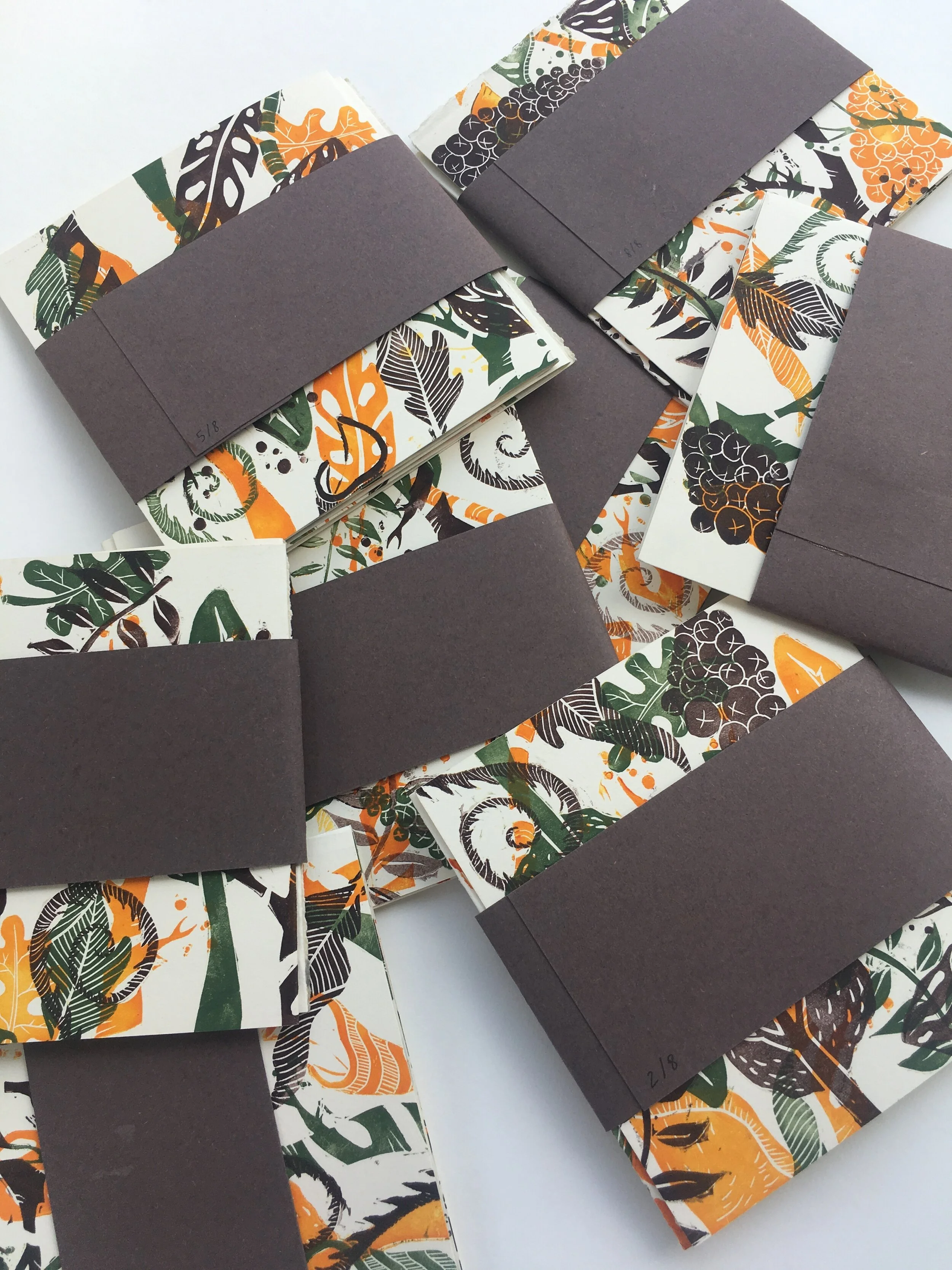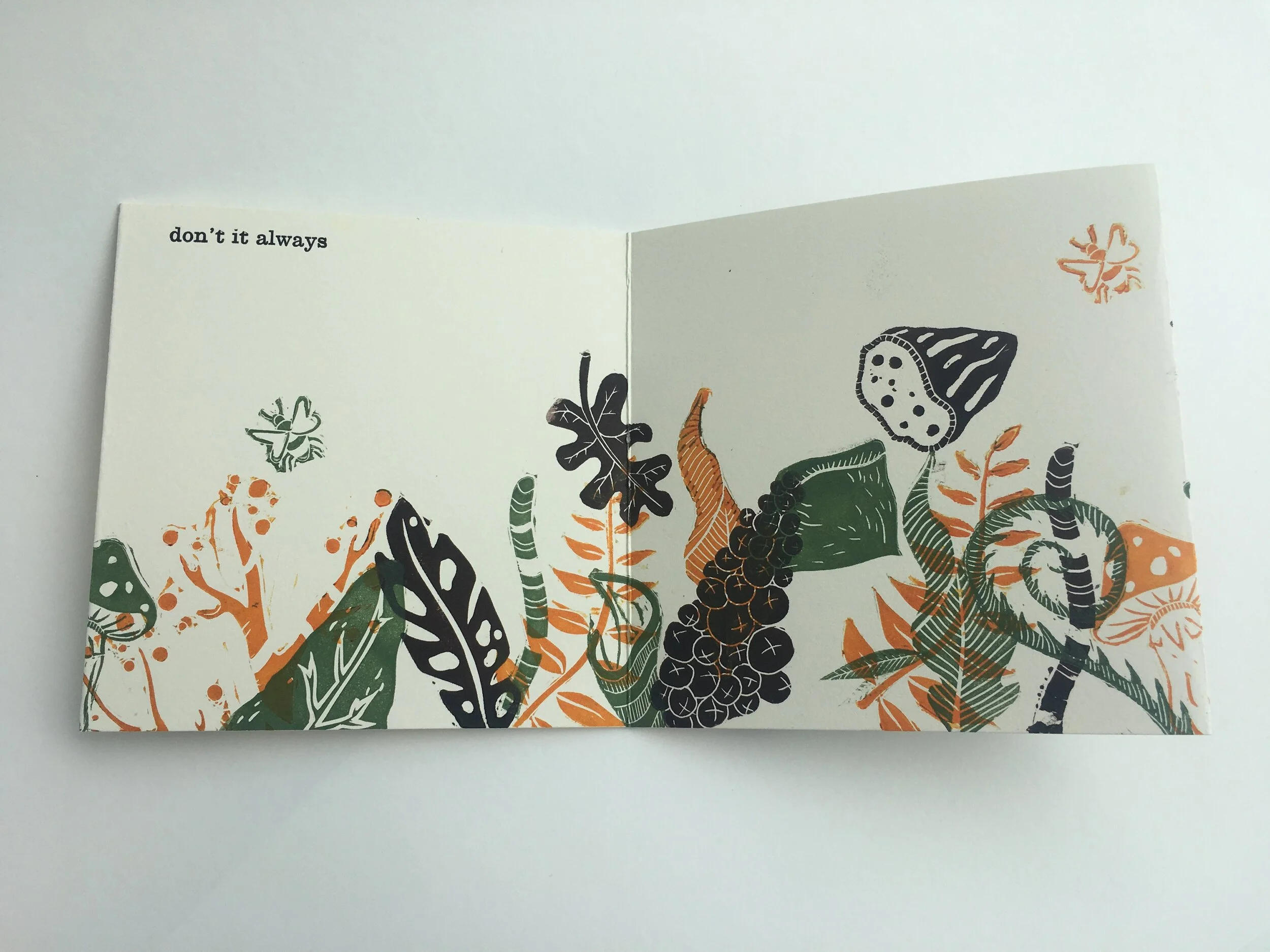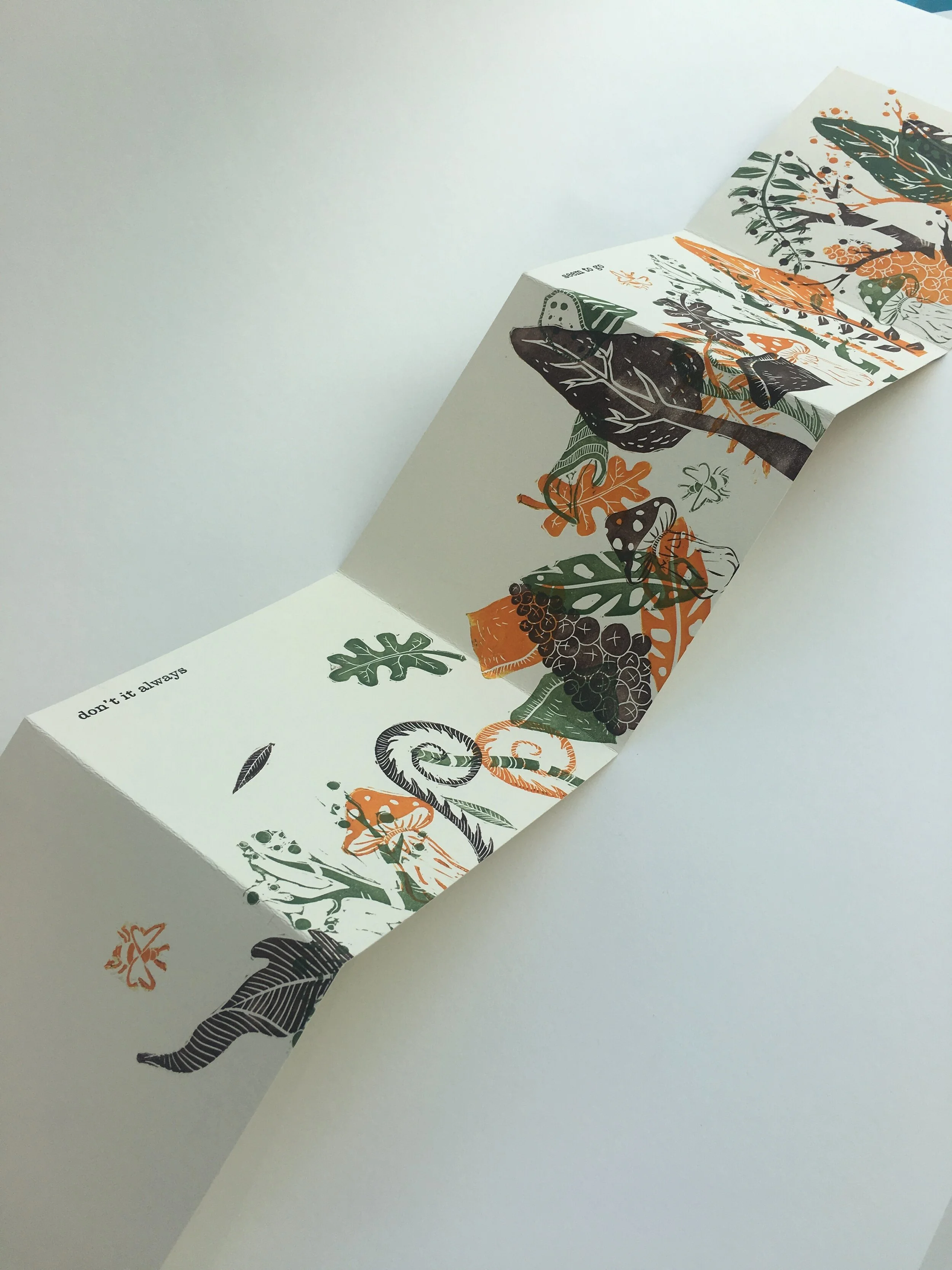 A concertina artist book made with letterpress and three colour linoleum relief stamps. Using lyrics from a Joni Mitchell song, Big Yellow Taxi, this concertina book laments the destruction of nature for profit by the human race, a theme that seems more relevant than ever. Each of the 8 booklets was randomly stamped so they are all unique monoprints.