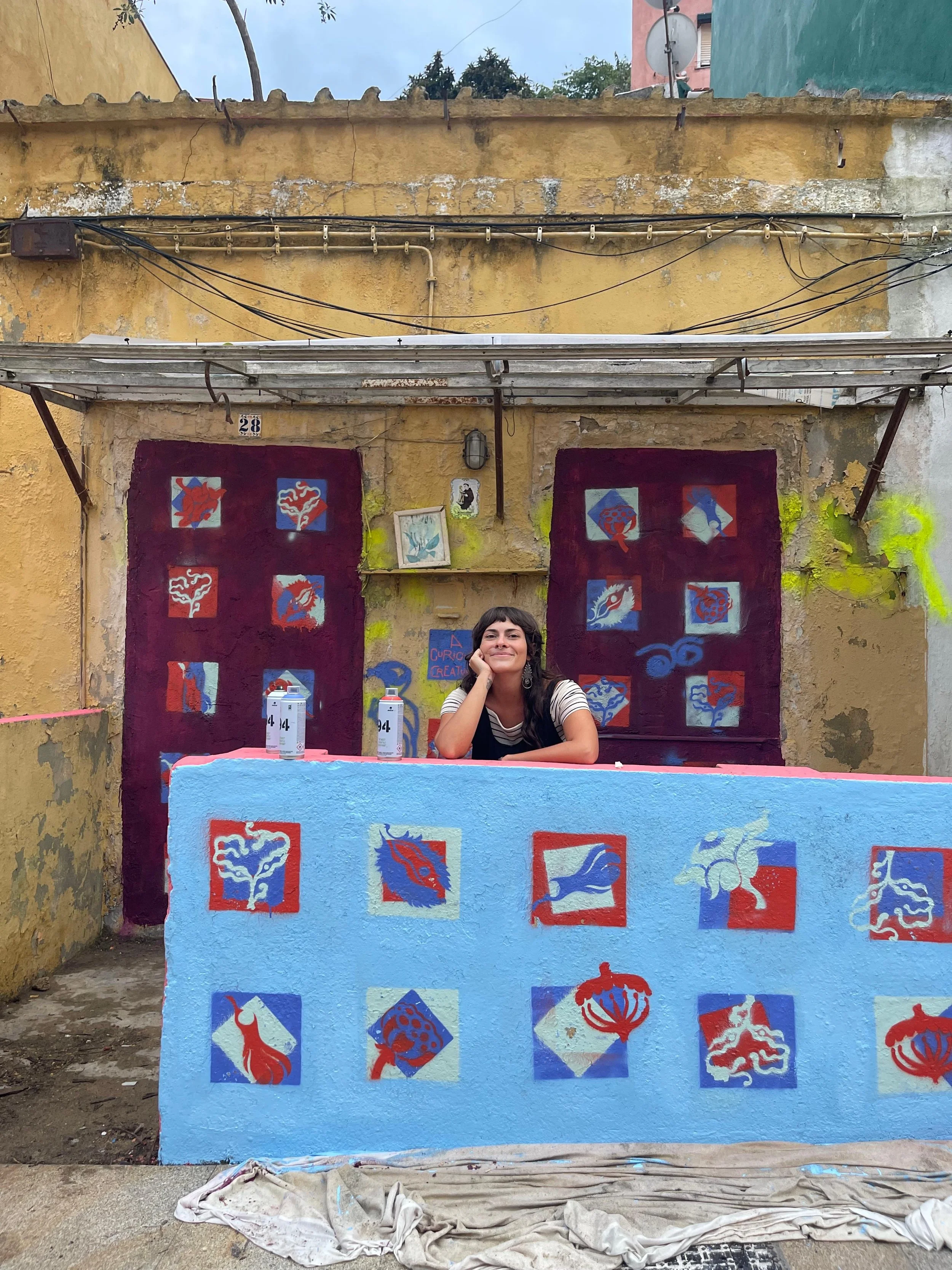 It’s been a recurring theme in my work lately to try to find ways to make the community participate and create in the spaces they inhabit, while making sure the final result is cohesive and beautiful. In this case I wanted to spark some life into this old house, painting it colourfully and providing passers-by the material to co-create the art on the walls. I cut out a series of stencils that could be mixed and matched in original ways that would fit, creating a tiled wall, much like the Portuguese azulejos we see on the streets of Lisbon.