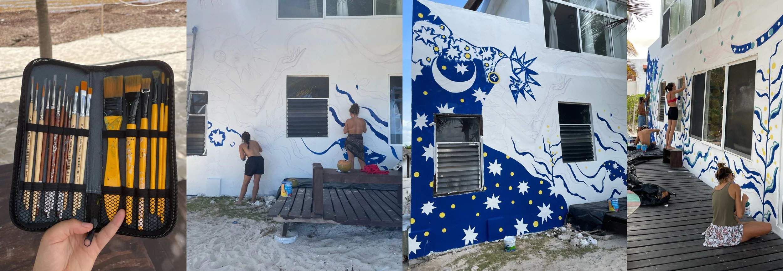 The plague of this paradisiac sea is the sargazo, an algae that is becoming an increasing problem in the coast. The use of fertilizant in crops goes into the water, and when it reaches the sea it fertilizes the sargazo, which grows more than it should and then dies on the coast, creating mountains of brown stinky residue. This is a clear warning from mother nature of the dangers of over farming and the death of our oceans. It was very present in the beach in front of us, and turning it into a beautiful plant on this wall was a way of elevating the ordinary and the unloved, and a reminder of the care we must take with our endangered environment.