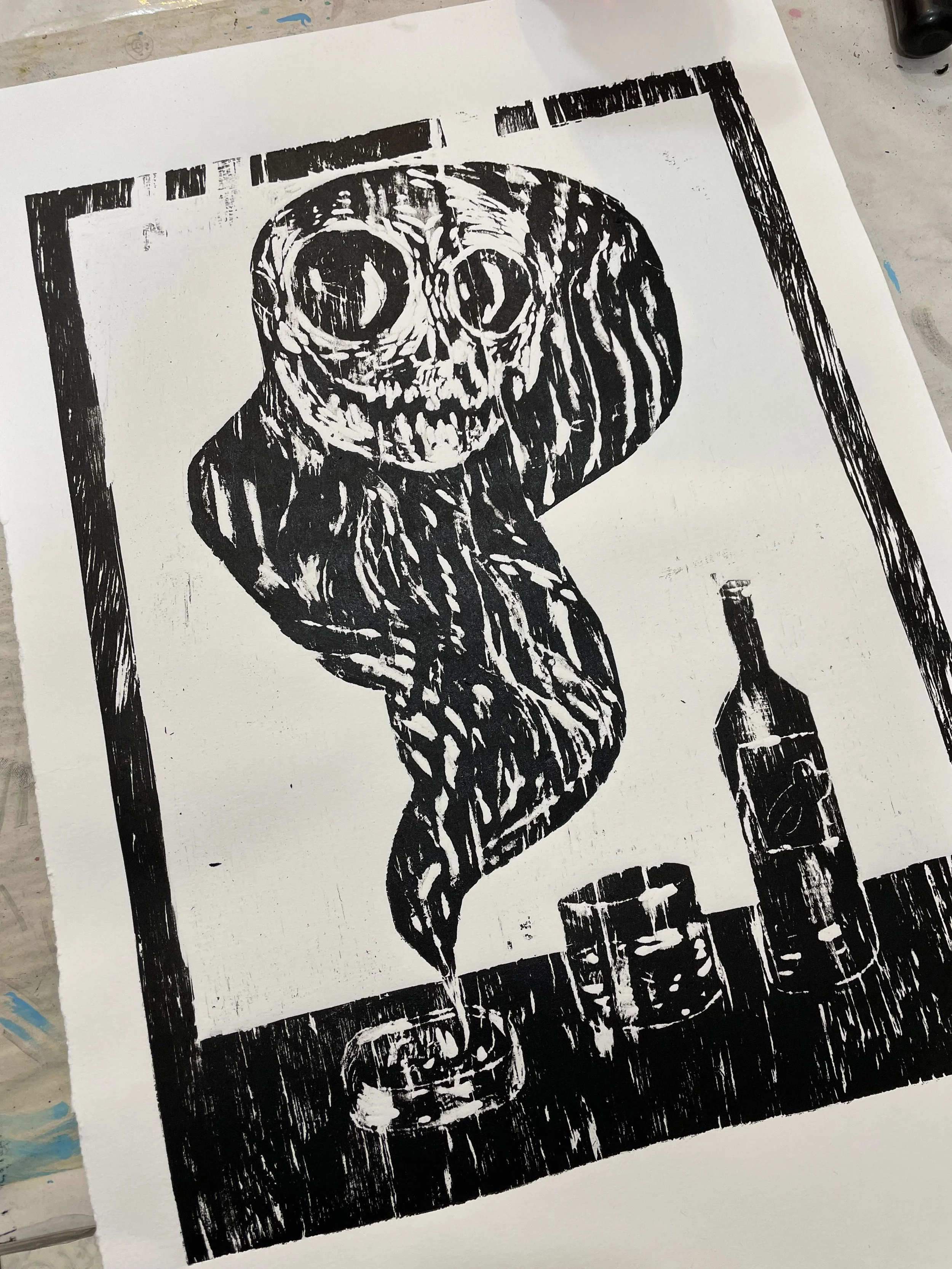 I made this while traveling in Mexico, in Galeria Codigo Tonal, in Oaxaca. It is a relief print made with the oaxacan technique, using wood and fire and a lot of strength. Made in two days, while drinking mezcal (always recommended while using sharp objects), chatting and running out of the building due to an earthquake.