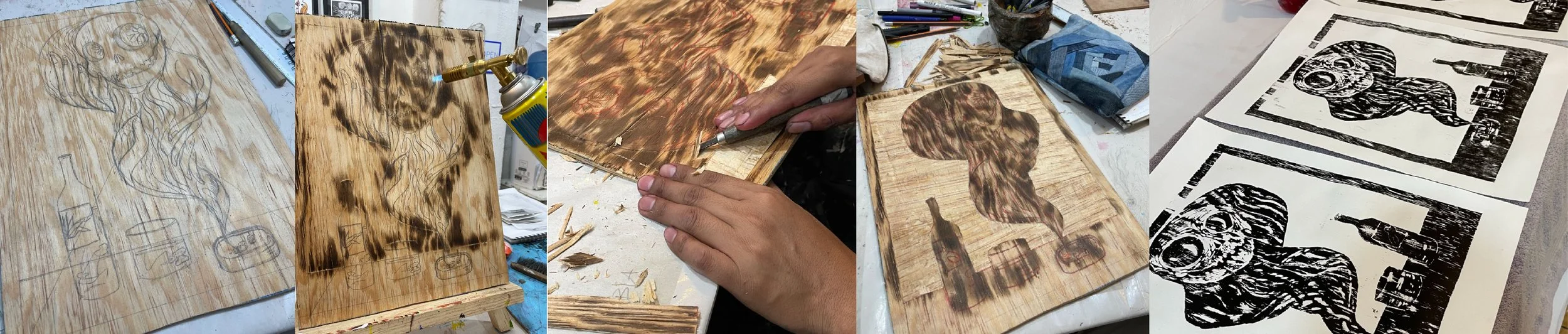 Learning this local technique that was brought here by Chinese immigrants and modified was really different from any printmaking I’ve ever done. I always associate cutting a surface with gentleness and patience and meditation, but these Mexicans got me sweating and stabbing and burning the wood. A different kind of meditation, to an extent. I had a blast.