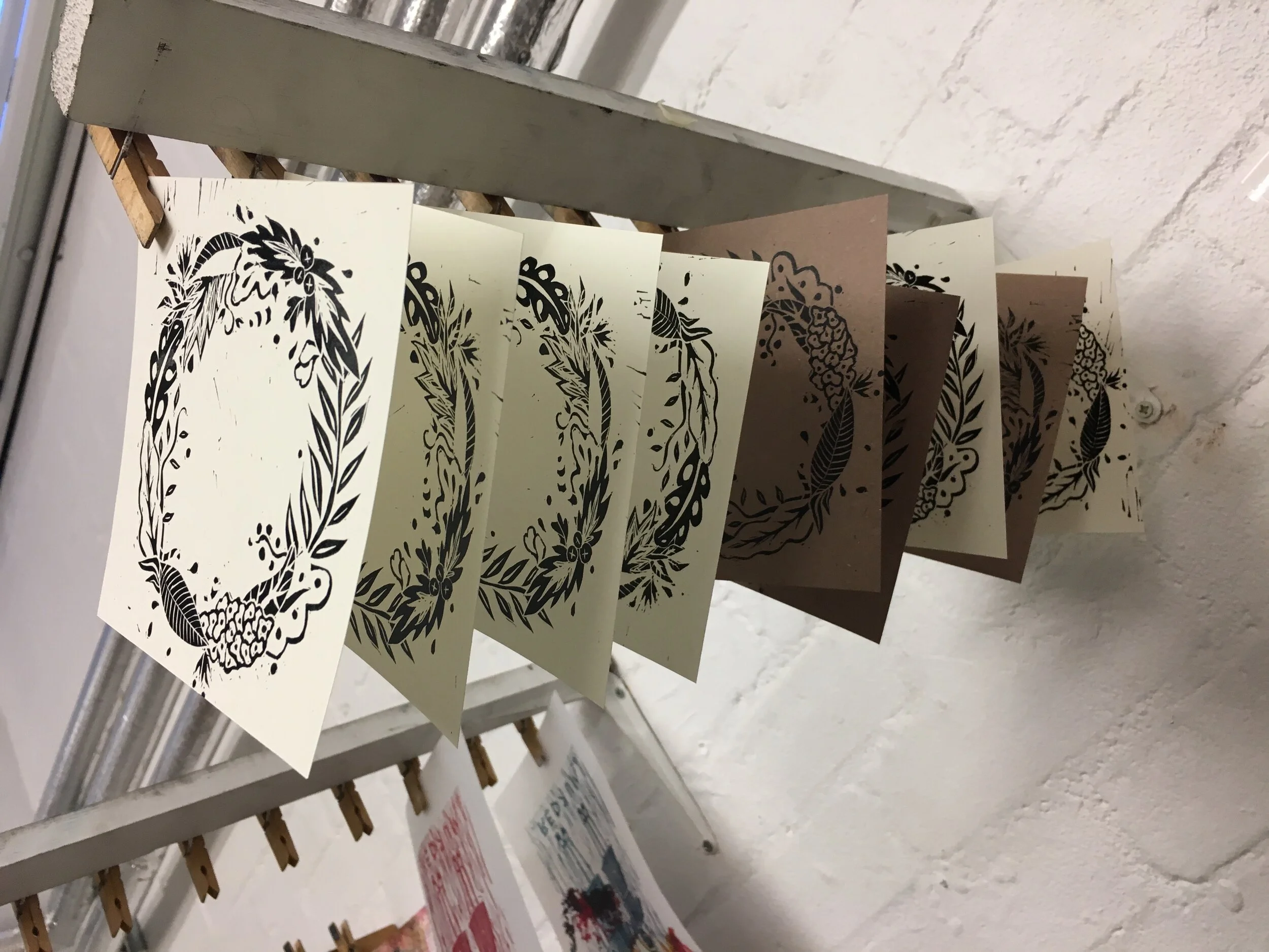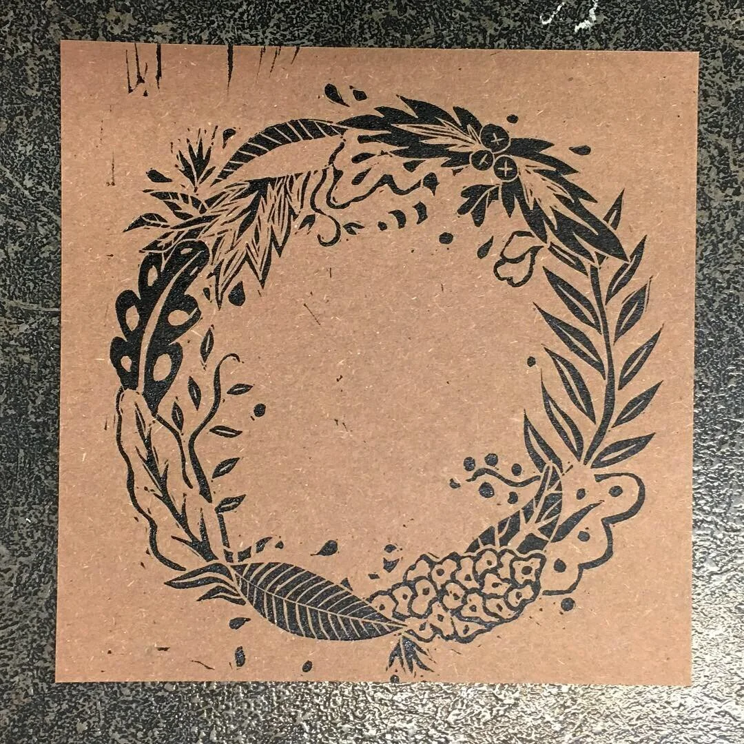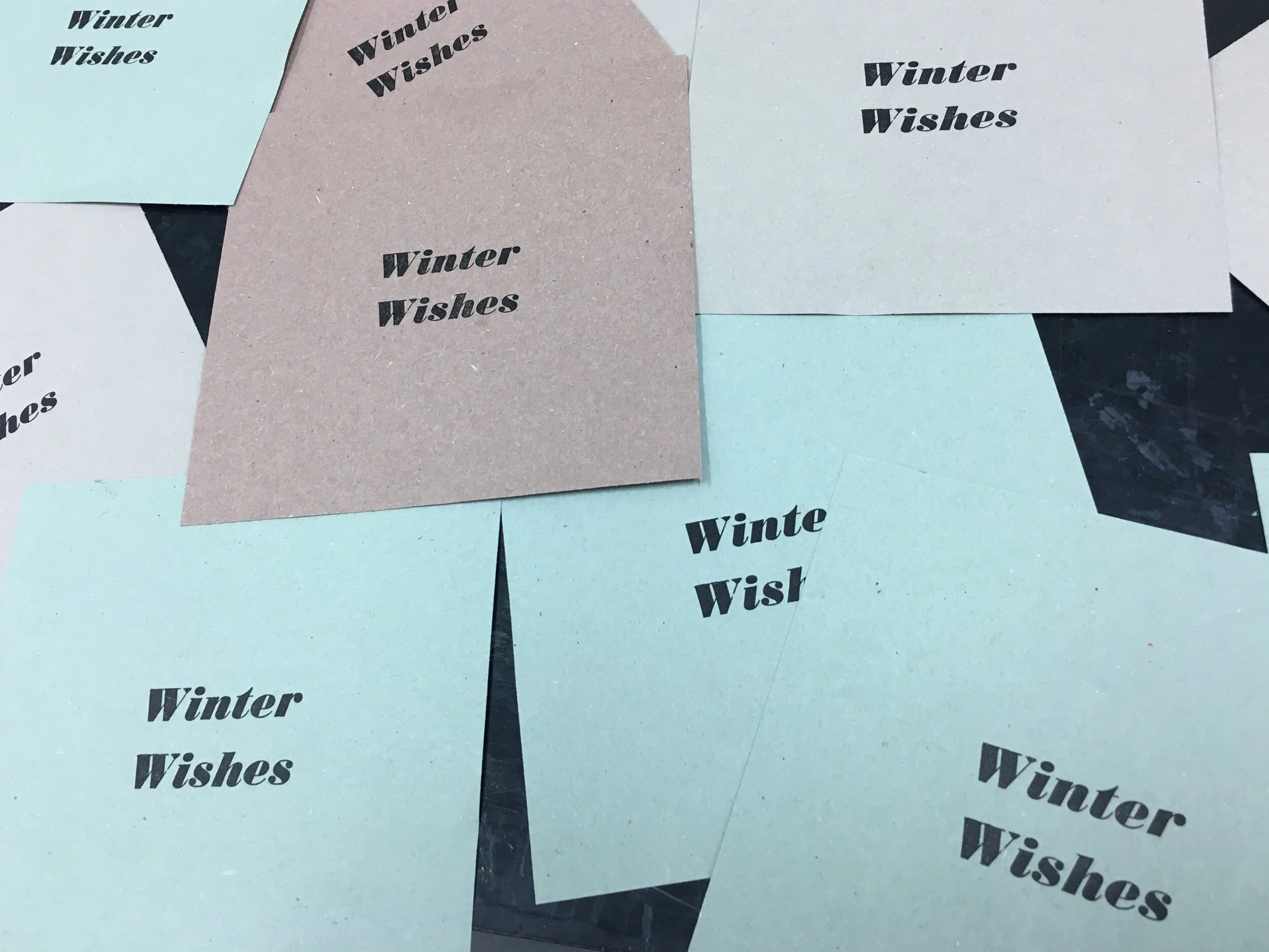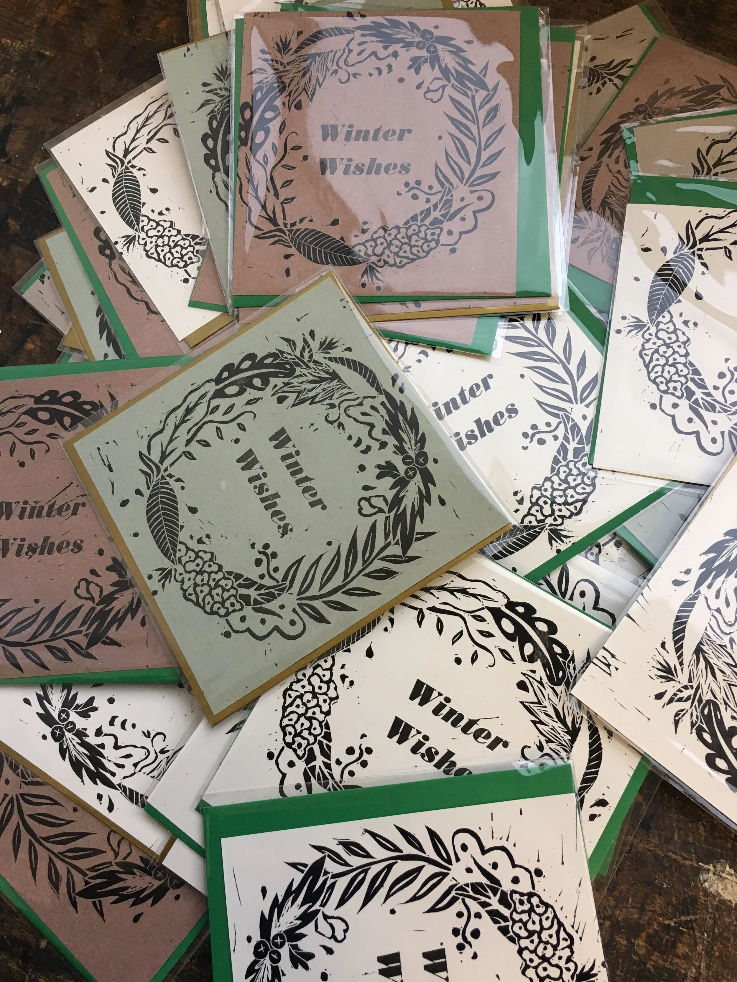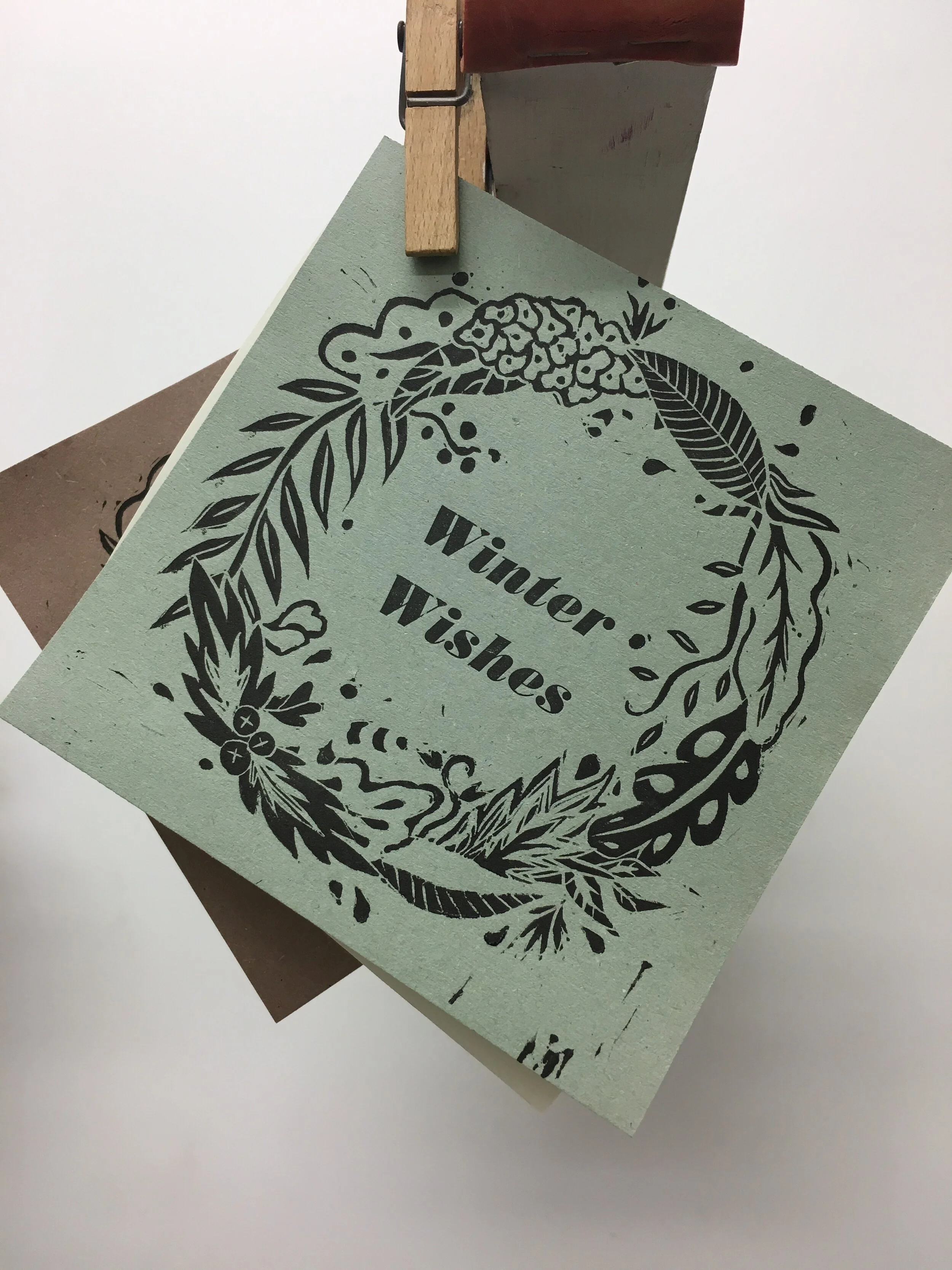 Christmas cards created using Linocut and letterpress. Comes in three different paper colours with square envelopes.
